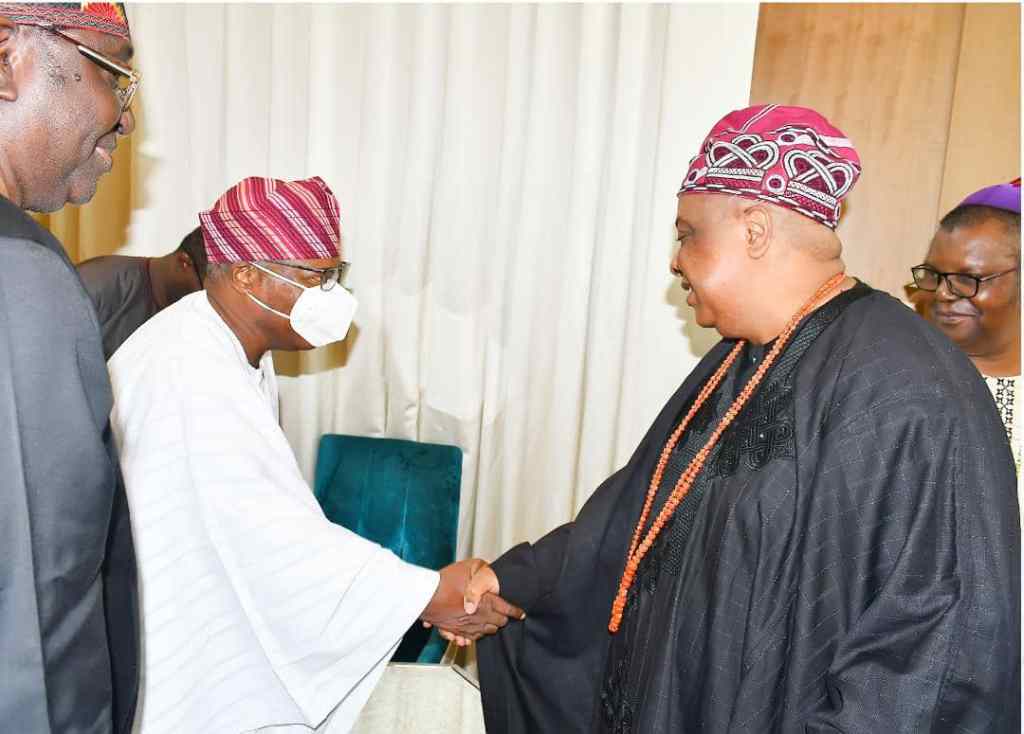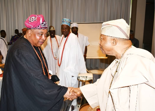 Akarigbo in warm handshake with Adebutu