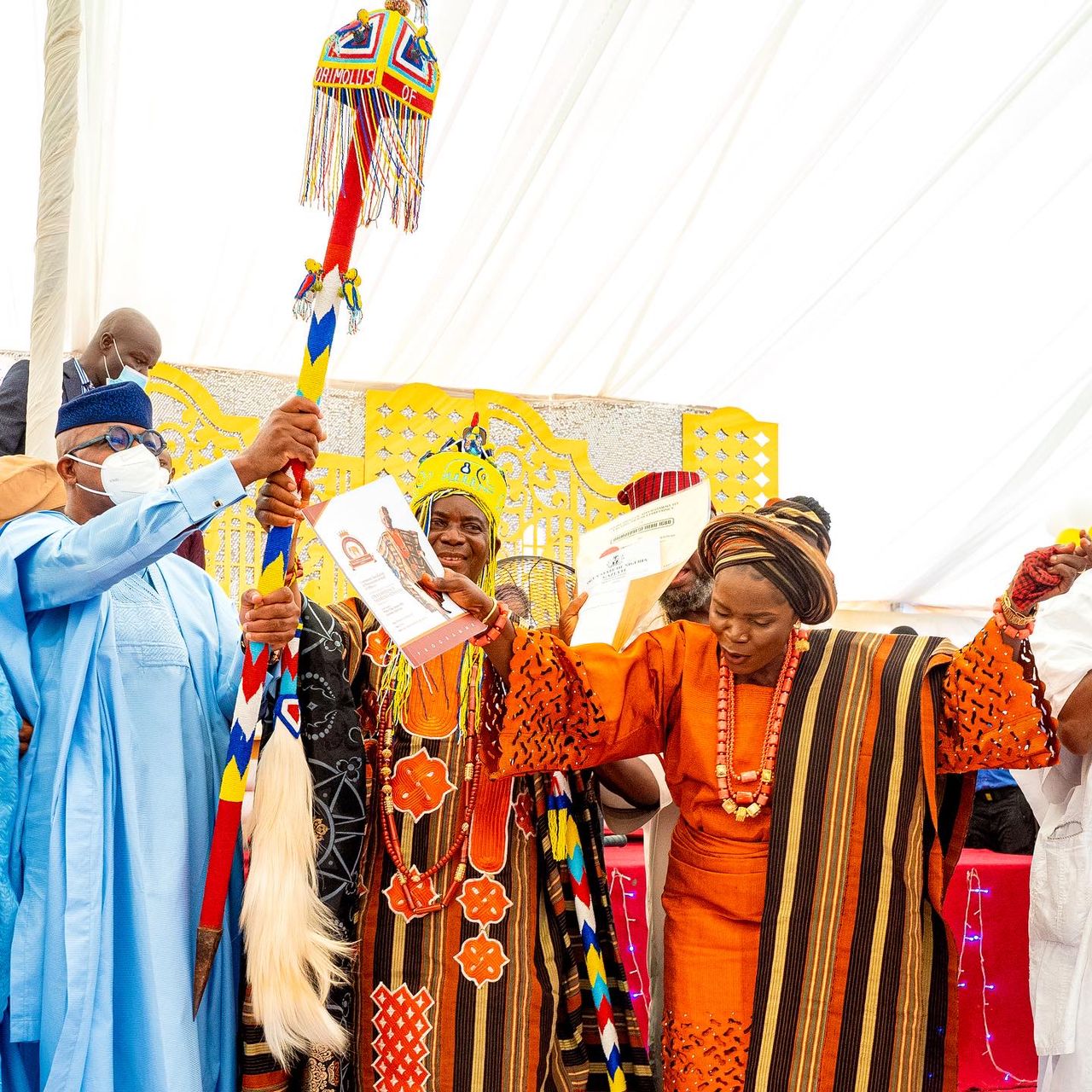 Representative of Gov. Abiodun, Akarigbo presenting Staff of Office to Oba Adeyemi