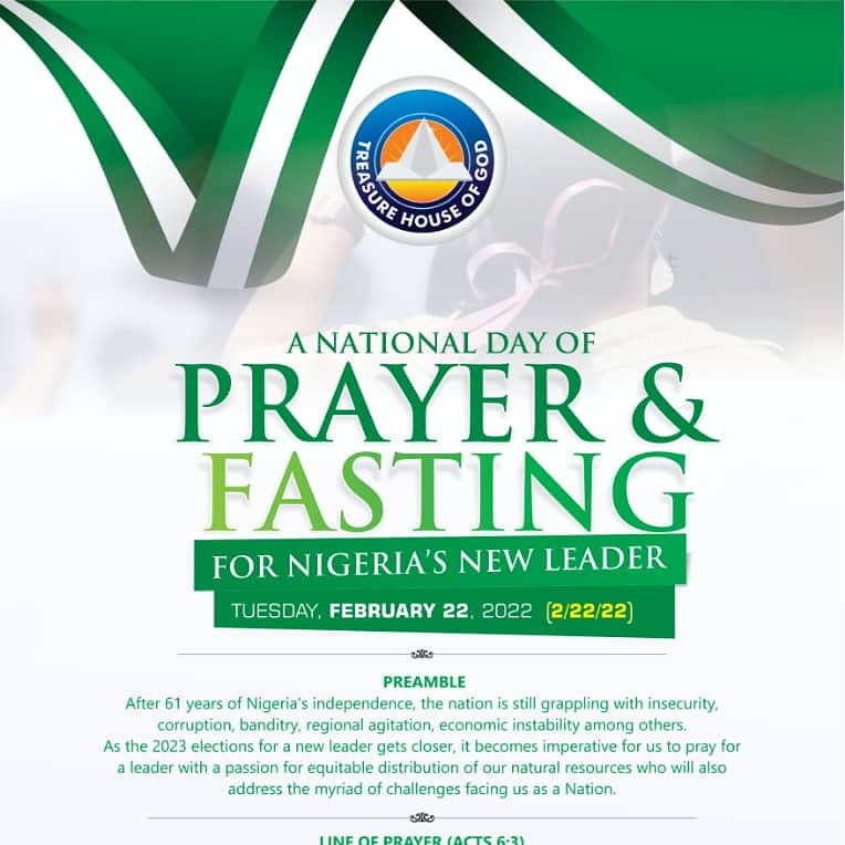 The Setman of Treasure House Of God said, aside for the immediacy needed for the prayer and fasting, that special day, Tuesday February 22, 2022 ( 2/22/22) has been divinely chosen for double portions of blessings, adding that the prayer and fasting was not about religion but for all Nigerians who desire to see Nigeria in greatness, and that it could be done wherever one could be on that day, because according to him, all that was revealed to him was that the chosen day is a day for double portions of blessings.