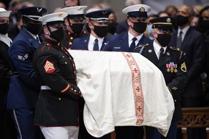 A military bearer team moves the casket during the funeral for former Secretary of State Colin Powell at the Washington National Cathedral, in Washington, Friday, Nov. 5.