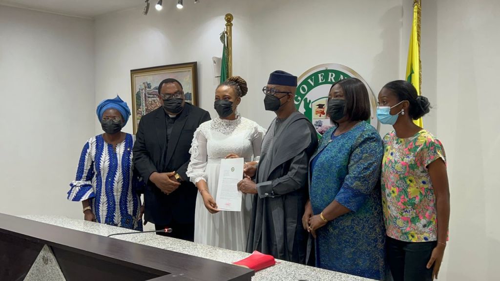 Prince Dapo Abiodun presenting Letter of Allocation to Dr. Joy Oyinlola Adesina, who was gifted a bungalow, 5million Naira cash award, and free scholarship for her residency programme at the Olabisi Onabanjo University Teaching Hospital, OOUTH in recognition of her sterling performance, having emerged Best Graduating Student ever produced in the history of Faculty of Clinical Sciences, OAU, Ile-Ife